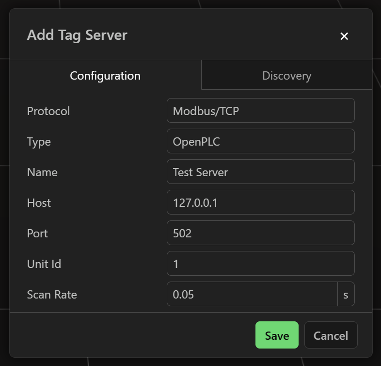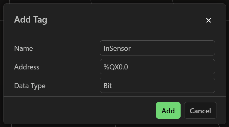 Once the tag server has been added, you can configure the tags that you want to read/write. Enter the address for the tag exactly as it is displayed in OpenPLC.