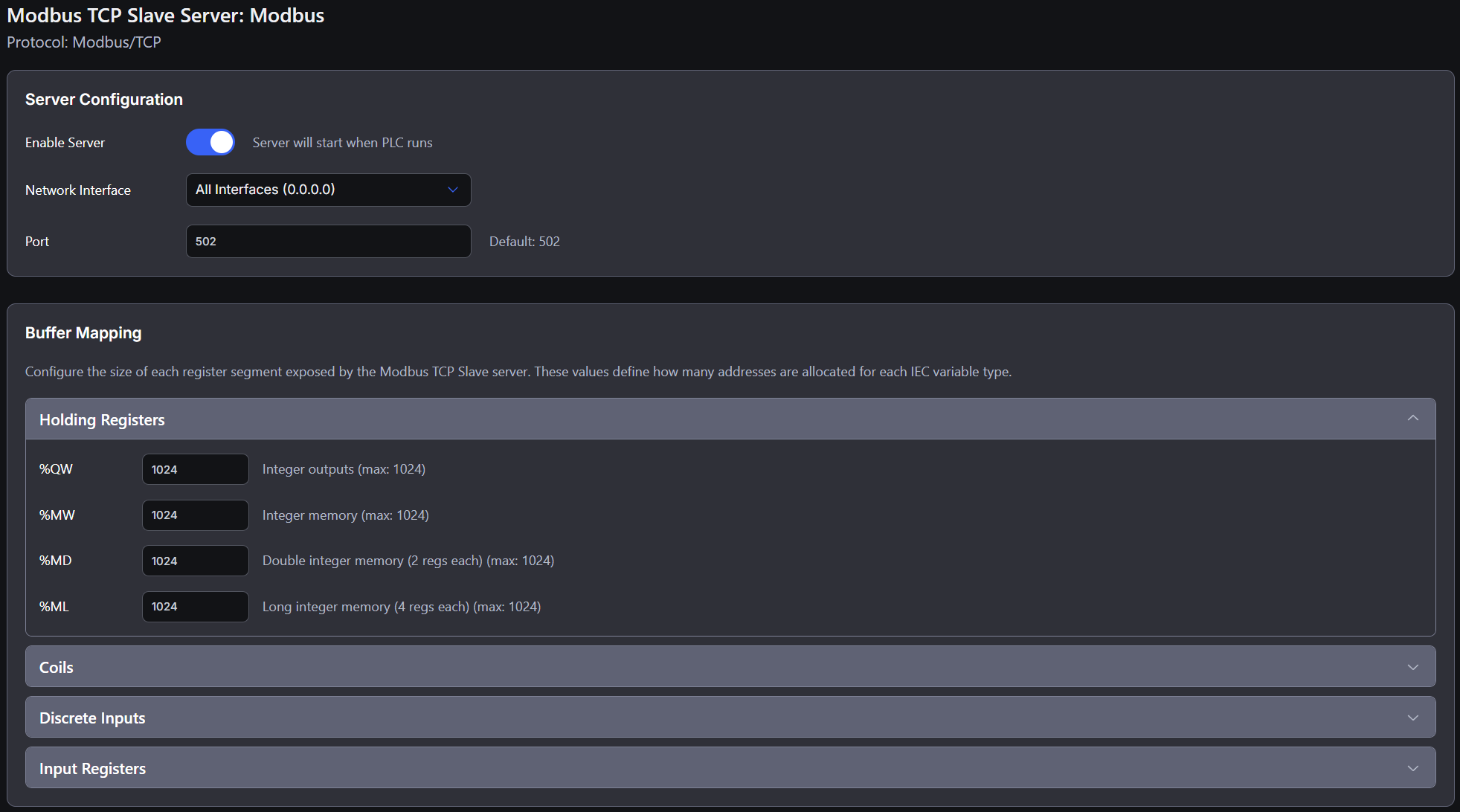 To connect to OpenPLC, first ensure that you have enabled the Modbus server in your OpenPLC project.